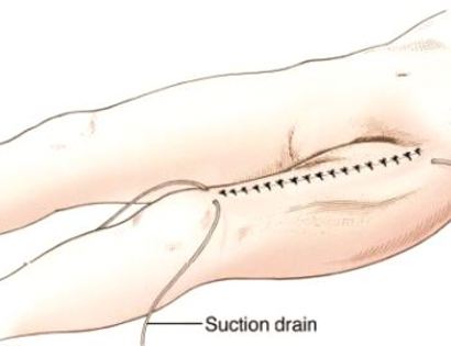 Closure and drains often placed for a period of time to evacuate fluid that can collect after surgery. Drains may be left in place for up to several weeks depending on size of defect, weight of patient and other factors until the wound heals. A bulky or compression bandage may be applied to control swelling and protect the extremity.
