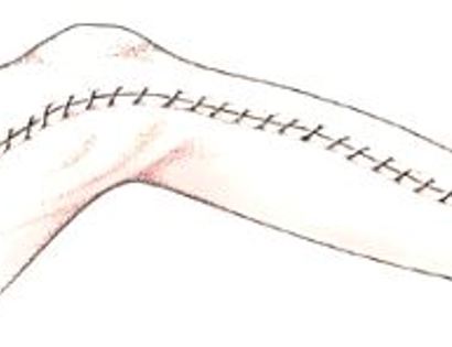 An incision is made that extends from the biceps femoris muscle over the knee joint and goes down the fibula bone to the ankle. The skin surrounding the previous biopsy site is left intact.