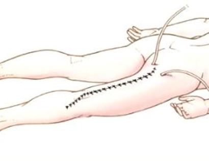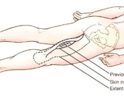 A long incision is made in the back of the leg, and if a previous biopsy was done the area will be marked as seen in the image.