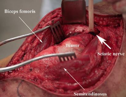 Separating all major arteries, veins, and nerves from the tumor. In rare cases a nerve (s) may need to be removed if it is involved by the sarcoma. For this type of procedure, it is vital that the sciatic nerve and femoral artery and vein are properly identified and mobilized away from the tumor. Once the blood vessels and nerves are separated, they can be retracted (moved away from the tumor) and protected throughout the procedure.